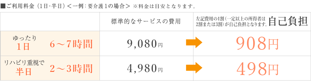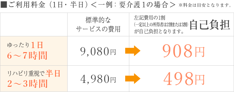 ●要介護1の方の場合、利用料は1日6時間~7時間利用で約9,080円、2~3時間利用で約4,980円ですが、