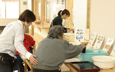 リハビリセンター100は「上げ膳据え膳」サービスをいたしません。利用者様自身が配膳、下膳を行っていただく工夫をしております。